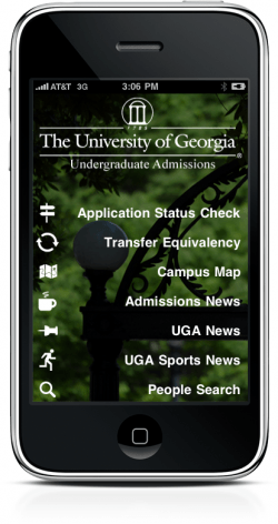 The University of Georgia Office of Undergraduate Admissions is proud to announce the release of version 1.0 of our iPhone App. This application can be downloaded for free from iTunes, and will run on any iPhone or iPod Touch.