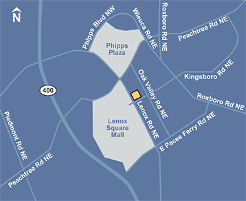 - Take Lenox Road Exit #2, and go left at end of ramp towards Peachtree Road
