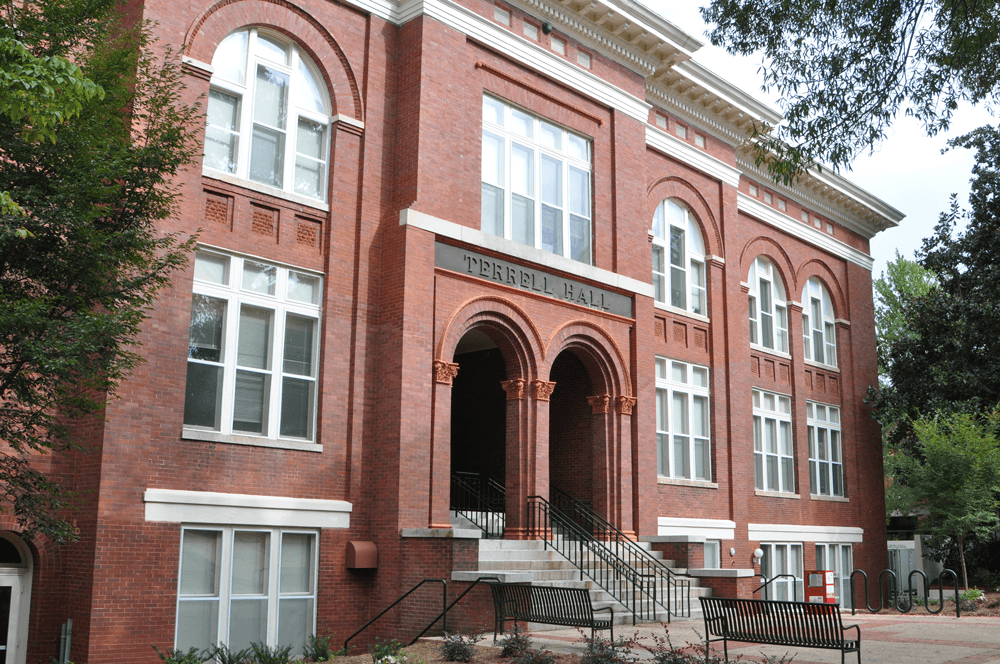 Take I-85 South to Exit 149, U.S. 441 South. Go south for approximately 20 miles. As you enter Athens, you will pass the Bulldog Inn on your right. Go under the bypass to the second traffic light and turn right onto College Avenue. This road will dead-end into Broad Street (across from the Arch). Turn left onto Broad Street and proceed to the next intersection (Jackson Street). Turn right onto Jackson Street and go two blocks to the North Campus Parking Deck on your left. Terrell Hall is directly across Jackson Street (to the west).